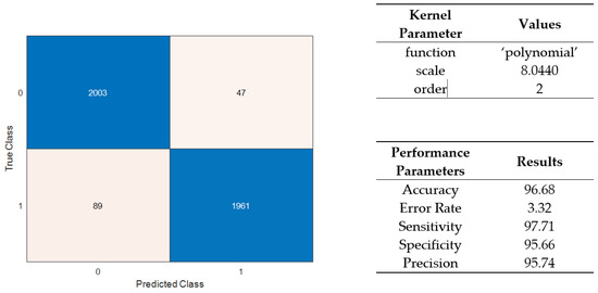 Confusion matrix and performance results for a quadratic SVM.