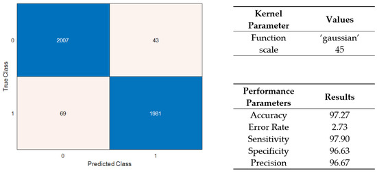 The model used for training the SVM classifier is a Gaussian kernel or radial basis function, which is given by Equation (3) [34]: