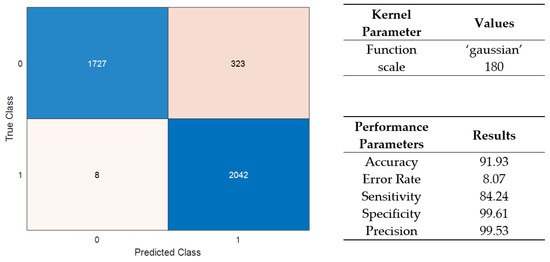Confusion matrix and performance results for a Gaussian kernel with medium spacing.