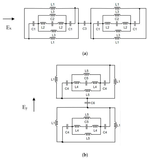 With an incident y polarized wave, we considered two unit cells in the y-direction with the equivalent circuit shown in Figure 2b. Now, only left and right arms of the outer square ring will be effective and are represented by the inductance ‘L1’. Since the width of the conductor remains the same, the value of this inductance will be L1. The eliminated squares on the top right corner and bottom left corners behave as capacitors (C4) aligned with the inductors (L4). The diagonal eliminated patch will act as capacitor (C2). The values of these inductors and capacitors will be different from C1, L2, and C2, respectively, due to different direction of the incident electric field. The conductor patch at the top left and bottom right is modeled as an inductor and is represented as L5. Inductances of L5 will be lower than inductances of L1 and L4 because of the larger width of the conducting patch. Coupling between two adjacent unit cells in the vertical direction is represented by C6, where C6 = C3.