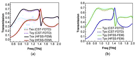 In order to validate the performance of the proposed structure, the optimized unit cell was resimulated in the Computer Simulation Technology (CST) time-domain solver. Close agreement between HFSS and CST results validate the performance of the proposed structure. Figure 3a,b depict the transmission characteristics for the incident x-polarized and y-polarized wave traveling in the ‘-z’ direction in CST and HFSS.