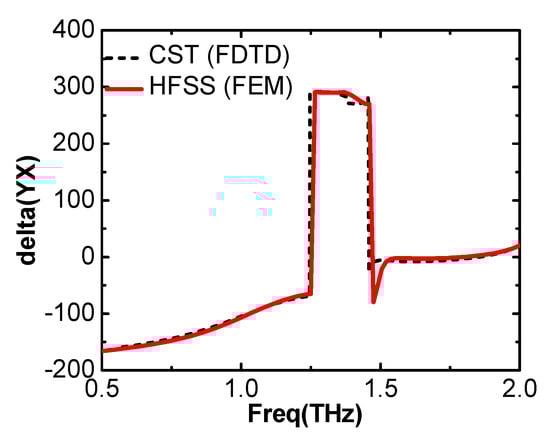 The phase difference between the transmitted x-polarized and y-polarized components with an incident x-polarized wave is shown in Figure 4. The phase difference between the two polarized components from 0.94 THz to 1.47 THz is close to −90° or +270°. There is a slight mismatch between the two results obtained from the two software packages. This might be due to different computational techniques; HFSS works on the finite element mesh (FEM) method, whereas CST’s time-domain solver works on the finite difference time domain (FDTD) method to solve Maxwell Equations. Two similar responses from different computational techniques confirm the validity of our proposed design; therefore, further simulations were carried out in HFSS.