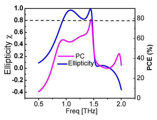 Figure 6 shows the ellipticity and PCE for the transmitted wave. It is clear from Figure 6 that from 0.94 THz to 1.47 THz, ellipticity is greater than 0.8. Moreover, the reasonable polarization conversion efficiency is observed from 0.94 THz to 1.47 THz. The value of ellipticity is found to be 0.97 at 1.085 THz and 0.999 at 1.445 THz, respectively, which is very good.