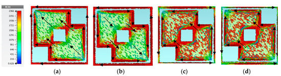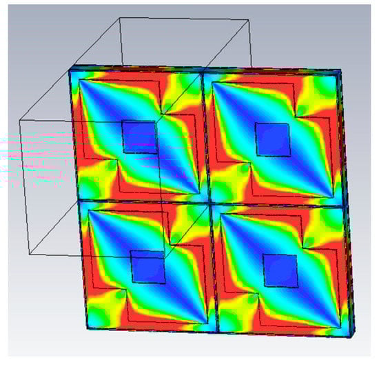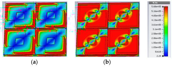 The proposed structure is an anisotropic structure which has dual diagonal symmetry. In such a case, the incident x-polarized wave generates transmitted x and y polarized waves and the incident y polarized wave generates transmitted x and y waves. To explain the physical phenomenon behind the proposed LCPC, we considered the surface current vectors at any two frequency points within the LCPC operation, f1 and f2: f1 = 1.085 THz and f2 = 1.454 THz. Figure 7 shows the surface current distribution with the incident x-polarized wave at different frequencies. Figure 7a shows surface current vectors in the top metasurfaces, whereas Figure 7b shows surface current vectors in bottom (ground) surface at f1. There are two parts of the metasurfaces that contribute to the linear to circular polarization conversion. One is the outer square ring and the other is the inner metallic tri-square eliminated square patch. Figure 7a shows that the current in the unit cell’s metal square ring travels antiparallel to the current induced in the ground surface. This will generate circulating current loops inside the substrate. It will give rise to magnetic resonance and equivalent magnetic dipoles will be created under x-polarized incident waves []. Figure 7c,d show surface current vectors on the top metasurfaces and ground surface, respectively, at f2. It is clear that besides contribution of outer square ring, the innermost eliminated square patch contributes to the wide bandwidth and the currents are parallel in the top and bottom surfaces. The outer square ring and tri-square eliminated square patch both give rise to electric resonance due to their parallel currents []. To support our work, the electric field distribution between the four adjacent cells of the array structure was investigated.