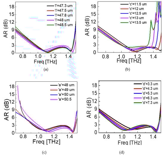 Figure 10c shows the effect of ‘a’ on the performance of the proposed converter. We varied ‘a’ from 48 µm to 50.5 µm while keeping all other parameters constant. Increasing ‘a’ has a similar effect as what was observed with ‘l’ as it also affects the width of the outer square ring, which influences the frequency of operation and hence varies the operating bandwidth. However, the tendency of change in the bandwidth varies as at a = 48 µm, the axial ratio goes beyond 3 dB, hence the transmitted wave is not a circularly polarized wave. At a = 49 µm and 51 µm, the response is almost the same, whereas the optimum response was obtained at a = 50 µm.