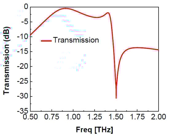 When an incident x-polarized or y-polarized wave strikes the proposed polarization manipulator, the transmitted wave is divided into two orthogonal components, one x polarized and the other y-polarized. These two waves, when having phases 90 degrees apart, give rise to circularly polarized waves. This concept was used to design a filter. Instead of x or y polarized waves, a slant (xy-polarized) wave was applied to the designed metasurface-based structure. It was observed that the waves passed through the structure at a resonance frequency within a certain bandwidth (decided by the conductor patch layout of the unit cell). It was confirmed that the same structure behaves as a bandpass filter, allowing 0.713 THz to 1.4346 THz waves to pass through, while rejecting other frequencies lying outside the band. This structure works over 67% fractional bandwidth and gives a sharp transmission zero at 1.505 THz (rejection > 30 dB). The loss at the receive frequency is as low as 0.3 dB. Since the rejection dip is at a higher frequency than the operating band, it can be used as a transmit reject filter in receivers to reject any spurious signal in the transmission frequency of the THz communication system. Figure 11 shows the transmission characteristics of the filter.
