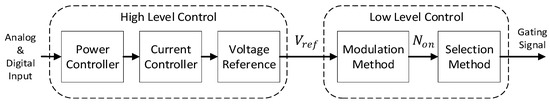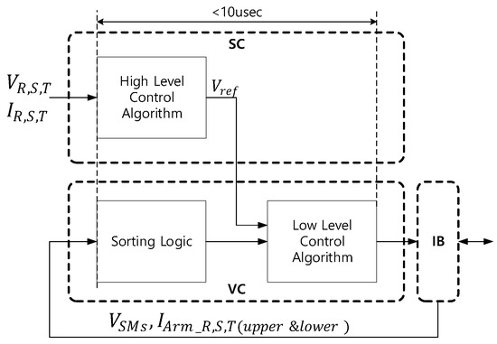 To determine the power transmission capacity of a MMC-HVDC system, the number of SMs and the control period must be determined first. The number of SMs is determined by the DC transmission capacity and the capacitor capacity of a SM. The control period should be designed so that the voltage level obtained by the voltage references can be changed by one level per cycle. In addition, it should be designed so that both the high-level control and low-level control can be operated within a control period, as shown in Figure 4.