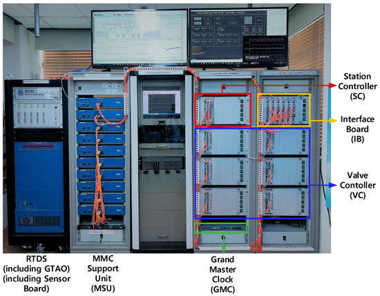 In order to construct the HILS for power converters, it is necessary to perform precise verification of each part while constructing the interface between the real-time simulator (e.g., RTDS or OPAL-RT) and the physical control system [6,7,8,9]. These parts can be divided into three categories: Platform, communication, and algorithm. It is necessary to collect data based on many experiments to see how all of the parts react under various conditions. The platform should be designed by defining the hierarchy of the controllers. In addition, a proper communication system should be constructed for mutual cooperation among these layers. Furthermore, it is necessary to consider the timing of the communications between layers. Experiments should also be conducted to find alternatives to the packet loss that can occur in each segment. Once the hardware design of the HILS system has been completed, software-based alternatives to the various problems that arise in the controller’s internal computing system should be prepared. When the AC grid voltages are unbalanced, circulating current suppression control algorithms should be selected according to the computation speed and the calculation performance in the physical control system [10]. In addition, various capacitor voltage balancing methods are implemented as FPGA logic, which can operate in parallel [11]. Furthermore, a method to design a 240 MW and 1 GW-class MMC-HVDC with optimal switching frequency and ripple is introduced.