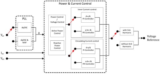 Figure 6 is a block diagram of the high-level control methods implemented in the physical control system. First, the characteristics of the two algorithms can be verified by implementing the phase locked loop (PLL) methods using the dq-frame delayed signal cancellation (dqDSC)-PLL method and the dqDSC with moving average filter (MAF) method. As can be seen from the power and current control block, the characteristics of the inner current control and the circulating current control, which were divided into a method using a proportional integral (PI) controller in a dq frame and a method using a proportional resonant (PR) controller in an a-b-c frame, can be compared. In addition, by adding a method of injecting the 3rd harmonic to the reference voltage, it is possible to compare the characteristics of the 3rd harmonic applied and not applied in real time. All of these algorithms were implemented in FPGA logic and could be operated at high speed.