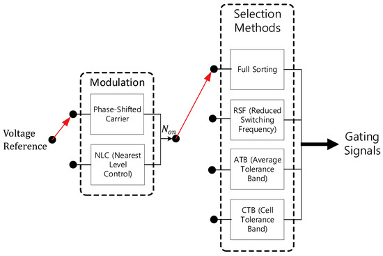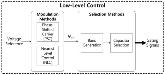 In the low-level control, was obtained by using modulation methods based on the voltage reference and a firing pulse generated using selection methods. Modulation methods in MMC-HVDC mainly used phase-shifted carrier (PSC) PWM and nearest level control (NLC) methods, as shown in Figure 10 [25]. In particular, the greater the number of sub-modules (SM), the more the NLC method was used [26]. Therefore, in this paper, the modulation method was performed using the NLC method. Selection methods were divided into band generation term and capacitor selection term. The band generation term was an added block for varying the switching frequency, and there are various ways to generate a tolerance band. The capacitor selection term is a method to switch the SMs and is the key term for capacitor voltage balancing methods.