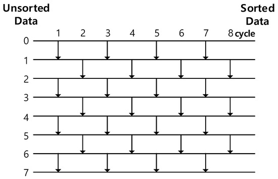 Parallel operation using a FPGA is indispensable for calculating high-level control and low-level control within 10 usec. Quick sorting, which is one of the fast sorting algorithms, performs recursive operations. Parallel operation of a recursive function based on FPGA hardware logic is complicated and difficult to sort in a desired time [22]. Therefore, in order to design a sorting algorithm based on a FPGA, it is necessary to select one of the most basic sorting methods, even though it is slow, such as bubble sorting, which is not implemented as the recursive. As can be seen from the time complexity , the bubble sorting algorithm has an operation speed corresponding to the worst case, where the comparison operation increases by the square of the number of data to be sorted [23]. However, if parallel sorting is performed by an even-odd bubble sorting network, as shown in Figure 8, it is possible to complete the sorting with only eight parallel comparisons of eight data. In addition, the computation time can be greatly reduced when compared with a single CPU. In other words, in order to sort - data, the sorting is completed with only - parallel comparison operations [24].