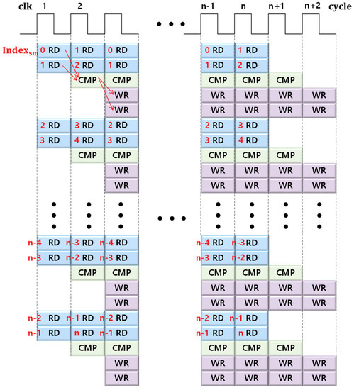 In order to implement this sorting network on hardware, it should have simultaneous access to Index 0–1, Index 2–3, Index 4–5, and Index 6–7. In the next cycle, Index 1–2, Index 3–4, and Index 5–6 are accessed at the same time because access to same memory is not possible at the same time.