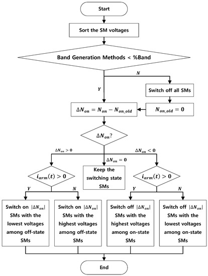 The proposed capacitor voltage balancing method is shown in Figure 11. As mentioned earlier, the capacitor voltage balancing method was divided into the band generation term and capacitor selection term. In the band generation term, the capacitor voltages were sorted and various band generation methods, such as ATB and CTB, were applied. In the paper, the average value of capacitor voltages was applied as an example to compare with the proposed method. This was the same as the conventional average tolerance band method. However, the proposed method was different from the conventional method in the following capacitor selection term. If the average value of the capacitor voltages is larger than the set band value, it can be divided by the positive term and negative term of , which is the difference between and . The positive term of turned on the SMs that had the lowest voltage when the arm current was positive among the turned off SMs and turned on the SMs that had the highest voltage when the arm current was negative among the turned off SMs. The negative term of turned off the SMs that had the highest voltage when the arm current was positive among the turned on SMs and turned off the SMs that had the lowest voltage when the arm current was negative among the turned on SMs. When the average value of the capacitor voltages was lower than the set band value, all SMs were switched off, the was initialized, and we proceed to the next sequence.