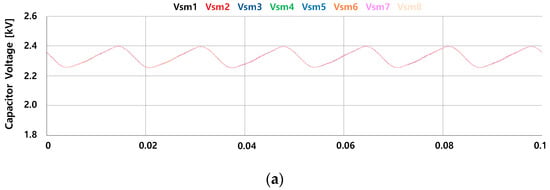 Figure 19 shows the capacitor voltage balancing waveforms of the ATB method and proposed method for the MMC-HVDC of 1 GW. Of the total 432 SMs (including 8% redundancy), only eight capacitor voltages of SMs were displayed. Figure 19a–c show ATB methods with 4%, 6%, and 8% tolerance bands, respectively. Figure 19d–f are proposed methods with 4%, 6%, and 8% tolerance bands, respectively. Similar to the waveforms of 240 MW specification, because the proposed method sorts the capacitor voltages at every cycle, the average value of the capacitor voltages takes longer to cross the band. In addition, the switching frequency of the proposed method is smaller than the switching frequency of the ATB method because the SMs maintain the previous switching state even when the average value of capacitor voltages is out of the band.