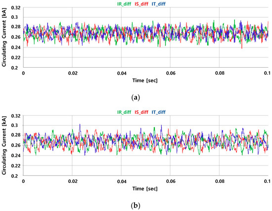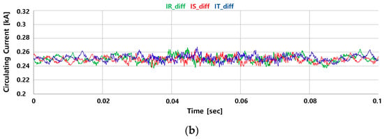 Figure 18 shows the circulating current waveforms of the ATB and proposed methods for the MMC-HVDC of 240 MW. This is the sum of the upper and lower arm currents for the R-phase, S-phase, and T-phase divided by two, respectively. Figure 18a–c show ATB methods with 4%, 6%, and 8% tolerance bands, respectively. Figure 18d–f are proposed methods with 4%, 6%, and 8% tolerance bands, respectively. As shown in the Figure 18, the proposed method has less ripple of circulating currents than the ATB method. Since the circulating currents are closely related to the quality of the DC-link voltage, it can be seen that the quality of the DC-link voltage can be improved.