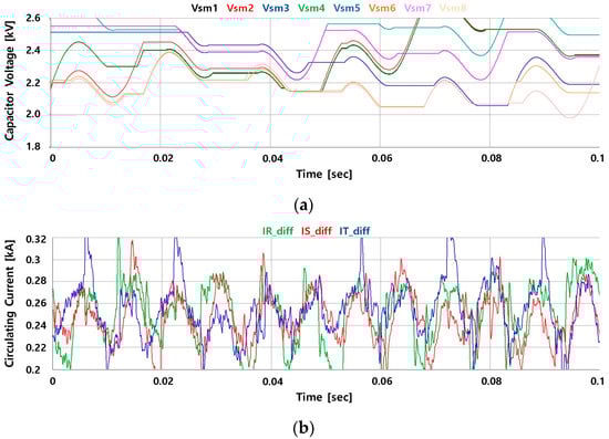 Figure 13a shows the waveform of capacitor voltages for the reduced switching frequency (RSF)-type sorting method, in which the switches are turned on/off according to the previous state of SMs. When charging, the SM which the voltage is the lowest and the previous state has turned off is turned on. On the contrary, when discharging, the SM which the voltage is the highest and the previous state has turned on is turned off. Therefore, it is the capacitor voltage balancing method that has the smallest switching frequency, while having the greatest ripple. As shown in Figure 13b, the magnitude of the circulating current is large. In this 1 GW MMC-HVDC system, the RSF method has a switching frequency of about 55 Hz.