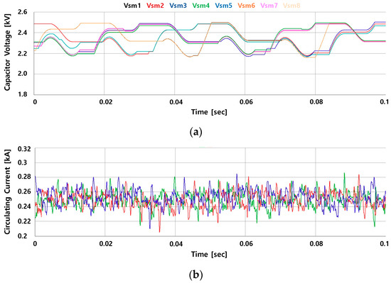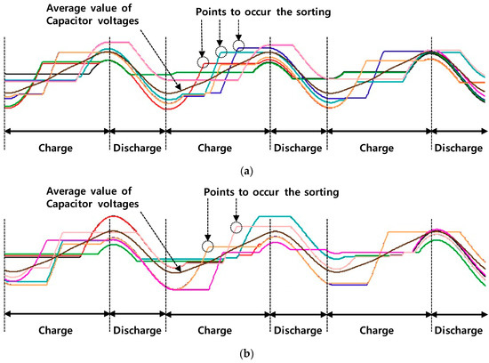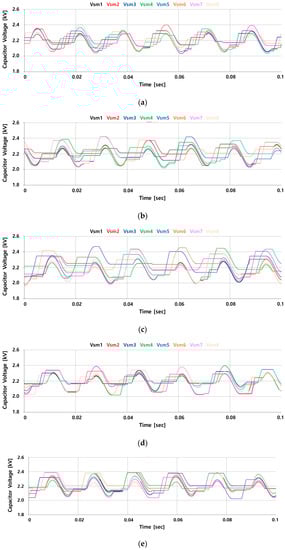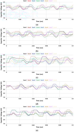 Figure 16a shows the waveform of the SM capacitor voltages for the 3% band ATB method, and Figure 16b shows the waveform of the SM capacitor voltage waveforms for the 3% band proposed method. The line in the middle is the average value of the total SM capacitor voltages, and the circled area is where the sorting occurs when the average value exceeds the 3% tolerance band. If sorting occurs, it means that the previous states of the SMs are initialized due to the rearrangement of the SM capacitor voltages. In other words, if the average value of capacitor voltages quickly exceeds the tolerance band, sorting will reset the previous states of the SMs, increasing the numbers of switching of the SMs. As shown in Figure 16, compared to the ATB method, the proposed method has a relatively slow cycle to occur the sorting. This means that the SM capacitor voltages of the proposed method are balanced more evenly throughout than in the ATB method.