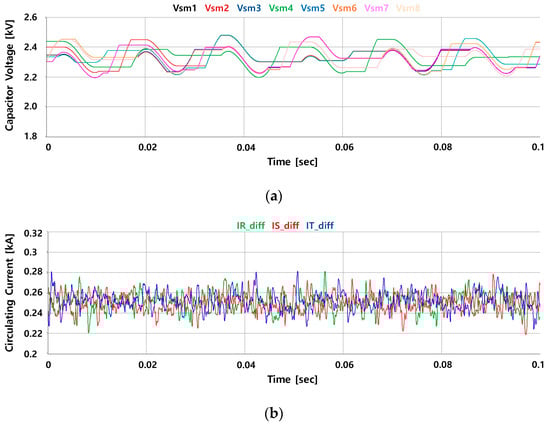Figure 15a shows the waveform of capacitor voltages for the average tolerance band (ATB) method, which calculates the average value of the SM capacitor voltages and generates a 4% band based on the average value of capacitor voltages. Figure 15b shows the waveform of circulating currents for ATB with a 4% band. In this 1 GW MMC-HVDC system, the ATB method has a switching frequency of about 150 Hz when the tolerance band of the average value of the capacitor voltages is set to 4%. As can be seen from the two tolerance band schemes, the tolerance band methods are a balancing technique that can trade off the DC-link voltage ripple and the switching frequency by varying the band. Therefore, it is a good balancing method for MMC-HVDC class or higher using many SMs.