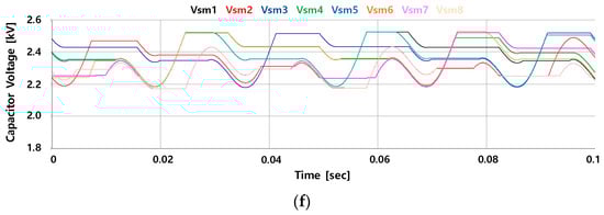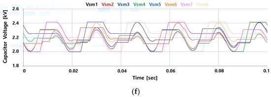 Figure 17 shows the capacitor voltage balancing waveforms of the ATB method and proposed method for the MMC-HVDC of 240 MW. Of the total 108 SMs (including 8% redundancy), only eight capacitor voltages of SMs were displayed. Figure 17a–c show ATB methods with 4%, 6%, and 8% tolerance bands, respectively. Figure 17d–f are proposed methods with 4%, 6%, and 8% tolerance bands, respectively. Because the proposed method sorts the capacitor voltages at every cycle, the average value of capacitor voltages takes longer to cross the band. In addition, the switching frequency of the proposed method is smaller than the switching frequency of the ATB method because the SMs maintain the previous switching state even when the average value of capacitor voltages is out of the band.