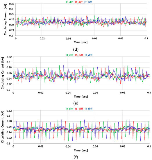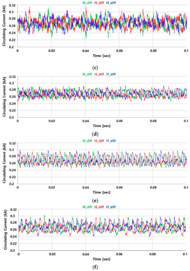 Waveforms of circulating currents to compare with the ATB method and proposed method for 1 GW-class MMC-HVDC transmission: (a) Circulating currents of the ATB method for a 4% tolerance band; (b) circulating currents of the ATB method for a 6% tolerance band; (c) circulating currents of the ATB method for an 8% tolerance band; (d) circulating currents of the proposed method for a 4% tolerance band; (e) circulating currents of the proposed method for a 6% tolerance band; (f) circulating currents of proposed method for an 8% tolerance band.