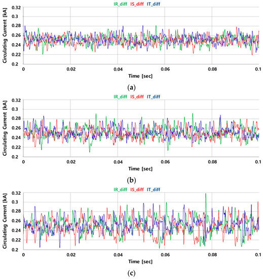 Figure 20 shows the circulating current waveforms of the ATB and proposed methods for the MMC-HVDC of 1 GW. This is the sum of the upper and lower arm currents for the R-phase, S-phase, and T-phase divided by two, respectively. Figure 20a–c show ATB methods with 4%, 6%, and 8% tolerance bands, respectively. Figure 20d–f are proposed methods with 4%, 6%, and 8% tolerance bands, respectively. Similar to waveforms of 240MW specification, as shown in the Figure 20, the proposed method has less ripple of circulating currents than the ATB method. Since the circulating currents are closely related to the quality of the DC-link voltage, it can be seen that the quality of the DC-link voltage can be improved.