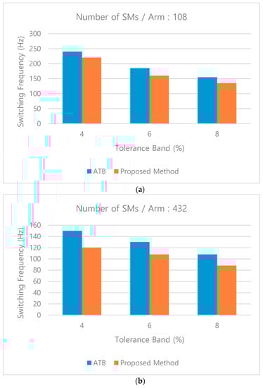 As shown in Figure 21, the proposed method proved to be able to perform better than the conventional method by comparing with the ATB method. Although other specific band generation methods can be applied, the proposed method is applied to band generation using the average value of capacitor voltages, which is one of the tolerance band methods. As shown in Figure 21a, in case of 240 MW-class MMC-HVDC, the proposed method reduces the switching frequency by about 13%, compared to ATB at 4%, 6%, and 8%, of the tolerance band. Likewise, as shown in Figure 21a, in case of 1 GW-class MMC-HVDC, the proposed method reduces the switching frequency by about 20%, compared to ATB at 4%, 6%, and 8%, of the tolerance band. As a result, the proposed method has about 20% better performance than the ATB method, and the larger the number of SMs, the better the effect.