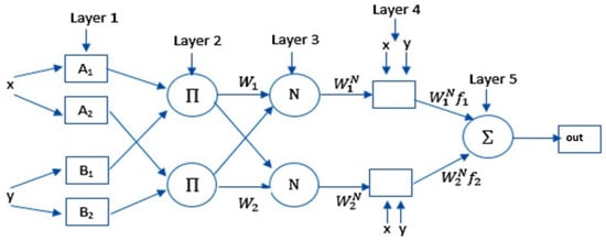 The Adaptive Neuro-Fuzzy Inference System (ANFIS) model is introduced in [] as a modification of traditional neural networks (NN) by combining it with fuzzy logic. Additionally, this model produces a nonlinear map between the input and output using the fuzzy IF-THEN rules. Basic ANFIS model is given in Figure 1, in which there are two inputs x and y and the output is out. The ANFIS model has five layers, each with a specific task. The first layer receives the x and y and computes the output of each node () using the generalized Gaussian membership functions () as follows: