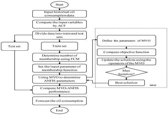 where T and P represent the actual training oil consumption and its prediction value, respectively. Thereafter, the best solution is determined, which has the smallest fitness value (). This best solution represents the optimal ANFIS model at the current iteration. Then, other solutions are updated based on this solution and this process is repeated until reaching the maximum number of iterations, which represents the stop condition. The next step in MVO-ANFIS is to test the quality of the best ANFIS model by applying the testing set and evaluate the prediction value using a set of measures. The last step in MVO-ANFIS is to predict oil consumption (forecasting process) for the next month. The stages of the proposed model are given in Figure 2.