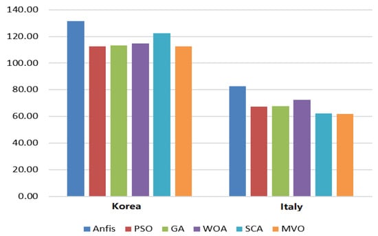 In general, MVO-ANFIS improved the original ANFIS 14% and 25% in Korea and Italy, respectively, based on the results of RMSE measure. Figure 5 illustrates the forecasting RMSE values of all algorithms in Korea and Italy.