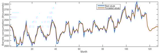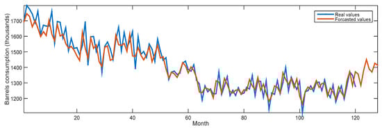The results of MVO-ANFIS for Korea and Italy in forecasting the new consumption for the 12 months from September 2017 to August 2018 are listed in Table 4. In this table, we can notice that the forecasted values seem to be similar to the observation values, which can be trusted. Moreover, Figure 6 and Figure 7 illustrate the real consumption values and the forecasted values of MVO-ANFIS for Korea and Italy, respectively. In these figures, the last 12 values show the forecasted curve of oil consumption.