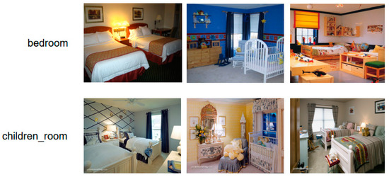 Intuitively, the images of scene recognition are different from the general images of object recognition. Many scene images contain a large number of objects, especially indoor scenes, and have a complex background, which brings severe difficulties for feature extraction. Many CNN-based methods extract features from local regions at different scales and complement global representation; however, they do not sufficiently consider the relationship between the local region and the context of the scene. Many extracted local regions are redundant and degrade the classification results of scenes. The scene images of different categories often contain the same and similar object regions, while the scene images of the same category probably contain very different object regions. In this paper, we focus on the discriminative regions in scene images. The feature extraction of discriminative regions can effectively solve the problems of between-class similarity and within-class difference. Figure 2 shows the images of two categories (‘bedroom’ and ‘children’s room’) of MIT indoor 67 dataset [10]. It can be seen from each column that the samples of different scene categories are very similar. Significant intra-class differences are remarkable in each row, which is caused by different backgrounds, objects, and angles. In order to achieve significant recognition results, a suitable way is to find discriminative region blocks that are good representations helpful to classification.