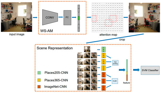 In this paper, we propose a weakly supervised attention map (WS-AM) method, which uses the gradient-weighted class activation mapping (Grad-CAM) [11] technique to obtain a small-scale attention map (AM) for each image. WS-AM uses the maximum output value information of the last fully-connected (fc) layer of CNN, but the image-level label information is absent, so it can be considered as weakly supervised. The regions with large local mean and large local center value in AM correspond to the regions of the original image that have strong discriminative power, while the others correspond to the redundant regions in the original image. The features are extracted from multi-scale discriminative regions per image. The features in small-scale regions are extracted in the softmax layer using CNN that is pre-trained on the ImageNet dataset [12] (i.e., ImageNet-CNN), and then they are coded by improved vector of locally aggregated descriptor (VLAD) [13] and normalized with L2-normalization. The features of large-scale regions are extracted in the softmax layer using CNN that is pre-trained on the Places365 dataset [9] (i.e., Places365-CNN), and then they are aggregated by max pooling. In order to obtain the global feature of the image, we use Places205-CNN (i.e., CNN pre-trained on Places205 dataset) [9] to extract the feature vector in the first fc layer (i.e., fc6 layer), and they are normalized with L2-normalization. Finally, the three feature vectors are concatenated to form the final image representation. In order to verify the effectiveness of WS-AM, the experiments were carried out on three datasets and achieved good performance.