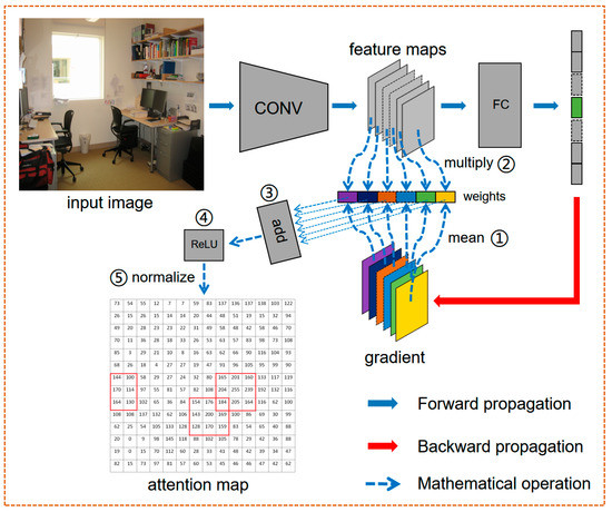 As shown in Figure 4, the input image is resized into the size of and propagated forward through the CNN to obtain the output value of the last fc layer. The maximum output value is back-propagated to calculate the gradient of the feature maps at the last conv layer, i.e., . represents the feature map of , so the gradient of is . Then the gradients of feature map are averaged to obtain the neuron importance weight as follows:
