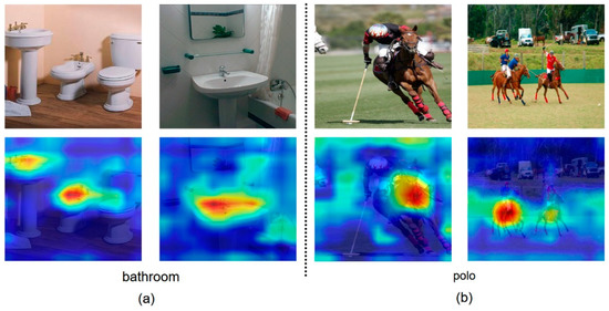 ReLU is applied to linear combinations of feature maps and weights because we are only interested in those features which have a positive impact on the maximum output value, and the intensity of those feature pixels should be increased to enhance the category with the maximum output value [11]. The backbone network we used for Grad-CAM is VGGNet, so the AM size is . In order to facilitate calculation and visualization, the values in AM are normalized to the range of (0, 255). If the AM is up-sampled to the input image size (i.e., ), each pixel value in the AM represents the importance of the corresponding pixel in the input image to the final classification result. Figure 5 shows four Grad-CAM visualization examples of the VGGNet pre- trained in the Places205 dataset. We only use weakly supervised information, but the discriminative region for each image is consistent with a human attention mechanism.