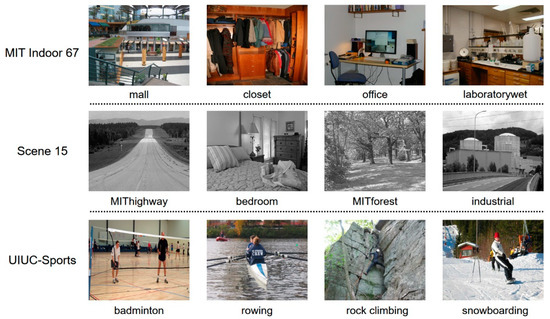 MIT indoor 67 dataset mainly verifies the performance in indoor scenes, while Scene 15 verifies the performance both in indoor and outdoor scenes. UIUC Sports verifies the performance in event scenes. The experimental parameters are the same on the three datasets.