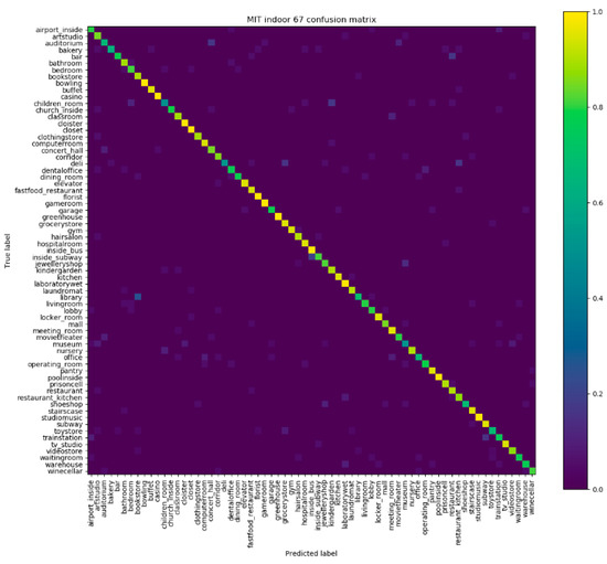 Table 2 shows the performance of our method on MIT indoor 67 dataset and its comparison with other methods. The references [1,2,15,53,54,55] are traditional methods, which mainly use some low-level features and mid-level features, such as SIFT, Object Bank [53], and BOF. Because these features only consider the shape, texture, and color information without any semantic information, they do not have high recognition accuracy. The references [5,6,8,56,57] are based on CNNs, and their overall recognition accuracies are higher than those of traditional methods. The CNN features of scene image have certain semantic information, and these features are learnt from a large number of well-labeled data, while not designed artificially. Our method is remarkably superior to the compared state-of-the-art methods in Table 2, which uses both semantic information and discriminative regions. In addition, the number of local regions used by our method is less than those in other methods, so the overall running time is significantly reduced. Figure 7 shows the confusion matrix of the MIT indoor 67 dataset. We see that the probability of classification is mostly concentrated on the diagonal line, and the overall performance is great. However, some categories have lower recognition accuracy than others, such as ‘museum’ and ‘library’ categories. These categories do not work well because the images of these categories are similar to each other and have complex backgrounds.
