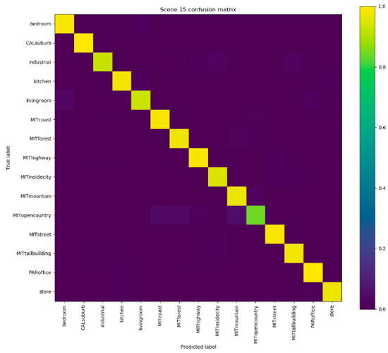 The experiments are carried out on Scene 15 dataset, which contains both outdoor and indoor scenes. Table 3 tabulates the comparison results in Scene 15 dataset. Our method achieves the recognition accuracy of 94.80% and is markedly superior to the compared state-of-the-art methods. Figure 8 shows the confusion matrix of Scene 15 dataset. The accuracy of the ’CALsuburb’ class reaches 100%. The accuracies of ‘MITcoast’, ‘MITforest’, ‘MIThighway’, and ‘MITmountain’ categories is very high, and it can be concluded that our method also performs well in outdoor scenes. However, it can be clearly seen from the confusion matrix that the accuracies in outdoor scenes are relatively lower than those in indoor scenes.