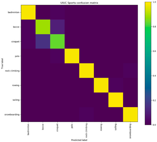 Table 4 tabulates the comparison results on UIUC Sports dataset. Our method achieves an accuracy of 95.12% and is superior to the compared state-of-the-art methods. UIUC Sports is a dataset of sport event scenes, which is different from the general scenes. The confusion matrix of the UIUC Sports dataset is indicated in Figure 9. We see that the recognition accuracy of the ‘sailing’ category reaches 100%, and the accuracies of the classes except ‘bocce’ and ‘croquet’ are good. It is because the contents of these two scene categories are similar, e.g., ‘people’ and ‘ball’.