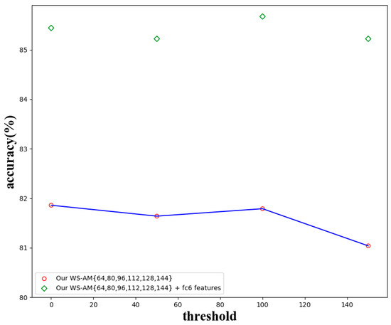 Threshold. Two strategies are used in Section 3 to screen the discriminative regions in AM. For the first strategy, different thresholds (0, 50, 100, 150) are experimented on MIT indoor 67 dataset and its impact evaluated on the recognition results. From the results in Figure 10, we see that the recognition accuracy is the highest when the threshold is 100 and the lowest when the threshold is 150 (without fc6 features). This indicates that more discriminative regions will improve the performance of the recognition, and fewer regions will result in a lack of local information. However, when the global features (fc6 features) are combined, the recognition accuracy is the highest when the threshold is 100, which is 85.67%. It is because the threshold only affects local representations, and when combined with global features, the overall trend will change. In this paper, 50 spacing is used to evaluate the threshold without considering smaller spacing. In future work, further optimization may lead to performance improvement.