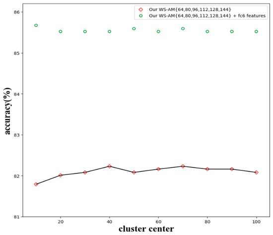 Cluster center. To evaluate the impact of a different number of cluster centers, an experiment on MIT indoor 67 dataset is carried out with a various number of cluster centers. Figure 11 shows the effects of a various number of cluster centers. It can be seen that when the number of centers is 40 and 70, the recognition accuracy is the highest (82.23% without fc6 features). The unreasonable number of cluster center leads to poor generality, and further, degrades accuracy. However, combined with the global features (fc6 features) the recognition accuracy reaches 85.67% when the number of centers is 10 because the VLAD centers only affect local representations.