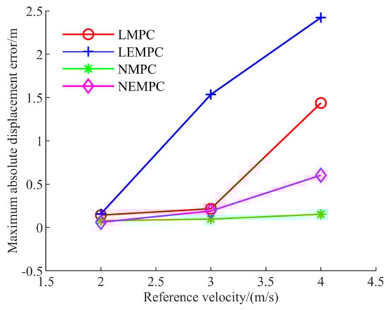 The simulation results at the reference velocity of 2 m/s are shown in Figure 1, Figure 2, Figure 3, Figure 4, Figure 5 and Figure 6. In this case, all of the controllers can control the mobile robot tracking reference path. At 2 m/s, the displacement error and the heading error of controllers are small. The real-time performance of NMPC and NEMPC is worse than that of LMPC and LEMPC. However, all controllers have much less computation time in the control period than the control period. Table 2 shows the maximum absolute values.