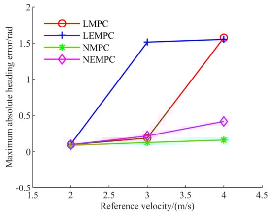 When the reference speed is 3 m/s, the simulation results are shown in Figure 7, Figure 8, Figure 9, Figure 10, Figure 11 and Figure 12. LMPC, NMPC, and NEMPC still can control the mobile robot tracking reference path. The error of LEMPC is divergent. Since it is meaningless to continue the simulation after the error diverges, we define that: Control failure when the absolute value of the heading error is greater than 1.5 rad. The simulation will be stopped halfway if the absolute value of heading error is greater than 1.5 rad.