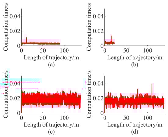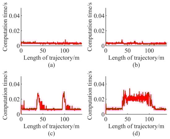 The computation time when velocity is 2 m/s. (a) LMPC. (b) LEMPC. (c) NMPC. (d) NEMPC.