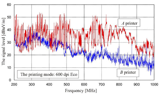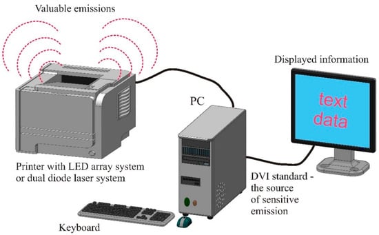 Like other devices included in a computer system [1,2], the printer can be subject to electromagnetic infiltration, or eavesdropping [3,4]. Therefore, efforts to reduce the level of susceptibility to electromagnetic eavesdropping are initiated for such devices. Organizational and technical solutions are the most often-used methods for limiting infiltration sensitivity of devices [5]. Technical solutions are limited to changes in the design of devices that typically increase the cost of such devices and sometimes limit their functionality. Therefore, it is desirable to find solutions that avoid these drawbacks and at the same time allow “safe” processing of classified information [6,7].