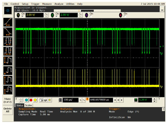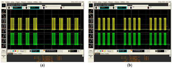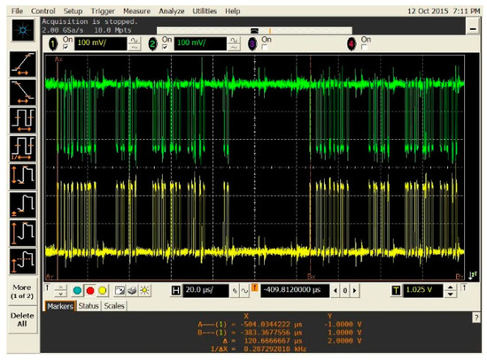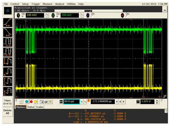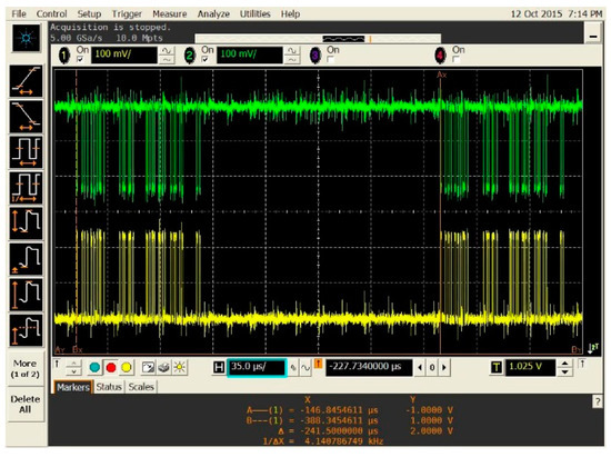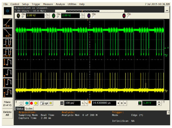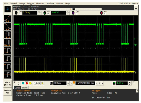For laser printers, changes of operating mode print quality options do have an effect on the structure of useful signals and thus the characteristics of sensitive RF emissions [10,11]. Information about the operating mode and print quality for printer A is encoded in the structure of the control signals (Figure 6, Figure 7 and Figure 8). The amplitude of these signals is approximately 4 to 5 V. The pulse repetition frequency also changes depending on operating mode and use of the toner-save option. However, these signals carry no information at all about the information being printed [12,13].