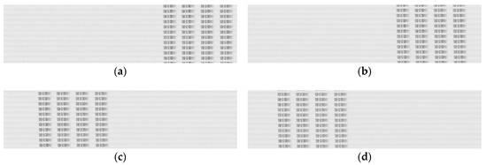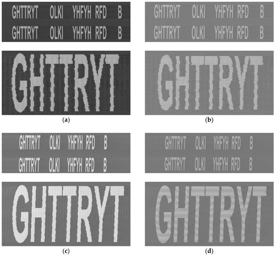 Fragments of reconstructed images from sensitive emissions of printer A: (a) 300 dpi mode without toner-save, (b) 300 dpi mode with toner-save, (c) 600 dpi mode without toner-save, and (d) 600 dpi mode with toner-save. Measured frequency of sensitive emission: f0 = 525 MHz, BW = 5 MHz. Image is inverted.
