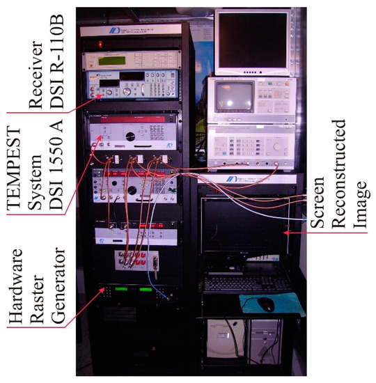 An anechoic chamber (Figure 14) was used to test these predictions. During the tests, sensitive emissions were measured with a bandwidth of 1 MHz in the frequency range from 2 MHz to 1 GHz. This frequency range was selected as a result of many years of experience in testing of laser printers and display screens. The aforementioned bandwidth value is the most effective for sensitive emissions from laser printers. During the tests, a TEMPEST DSI 1550A receiving system (20 Hz to 22 GHz), which can be seen in Figure 15, was used.