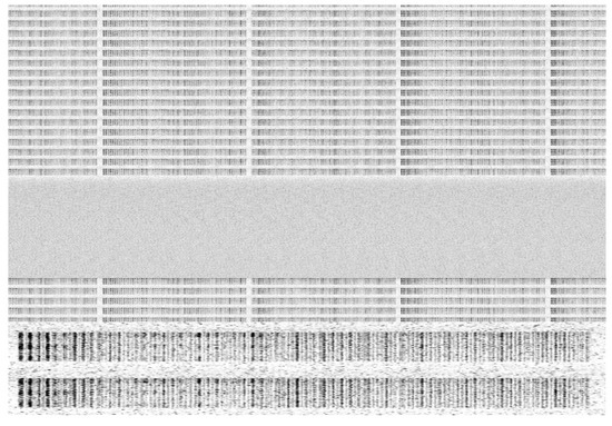 Example of reconstructed image from sensitive emission for a two-diode laser printer, 660 dpi mode with the “Eco” option turned on. Measured frequency of sensitive emission: f0 = 444 MHz, BW = 5 MHz. Image is inverted.