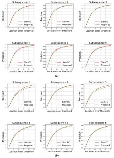 The precision plots of VOT2014 and VOT2018 over the six subsequences are shown in Figure 3a,b, respectively. The x axis is the location error threshold, which is from 0.5 to 25 pixels with the pixel gap of 0.5, and the y axis is the average success frame rate of the algorithms over all the videos in the dataset. As shown in the graphs, the tracking precision between SiamFC and the proposed algorithm is almost the same. Table 1 and Table 2 show the precision (with the local error threshold of 20 pixels), AUC, and IoU of VOT2014 and VOT2018 over the six subsequences, respectively. The results from Figure 3, Table 1 and Table 2 indicate that extracting different scales of feature maps from the largest scale feature map insignificantly degenerates the tracking performance with respect to precision, AUC, and IoU.