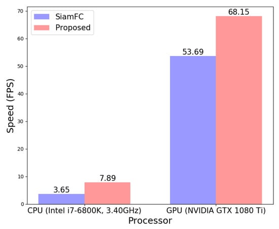 The average algorithm speed is shown in Figure 4. In the case of using only the CPU, the proposed algorithm is about 2.2 times faster than SiamFC. The results demonstrate that the proposed algorithm significantly improves the tracking speed with little tracking precision loss. In the case of using the GPU, the proposed algorithm is about 1.3 times faster than SiamFC. The GPU can be used for parallel computing of multiple feature maps, so the speed improvement is less than the CPU case. However, for the embedded systems where GPUs are not available for computing deep features from the search images, the proposed algorithm is more applicable than SiamFC. Figure 5 shows six snapshots of the videos in the VOT2018 ST dataset and the bounding boxes of the proposed algorithm. As shown in the figure, the proposed algorithm adjusts the scale changes of the objects during tracking.
